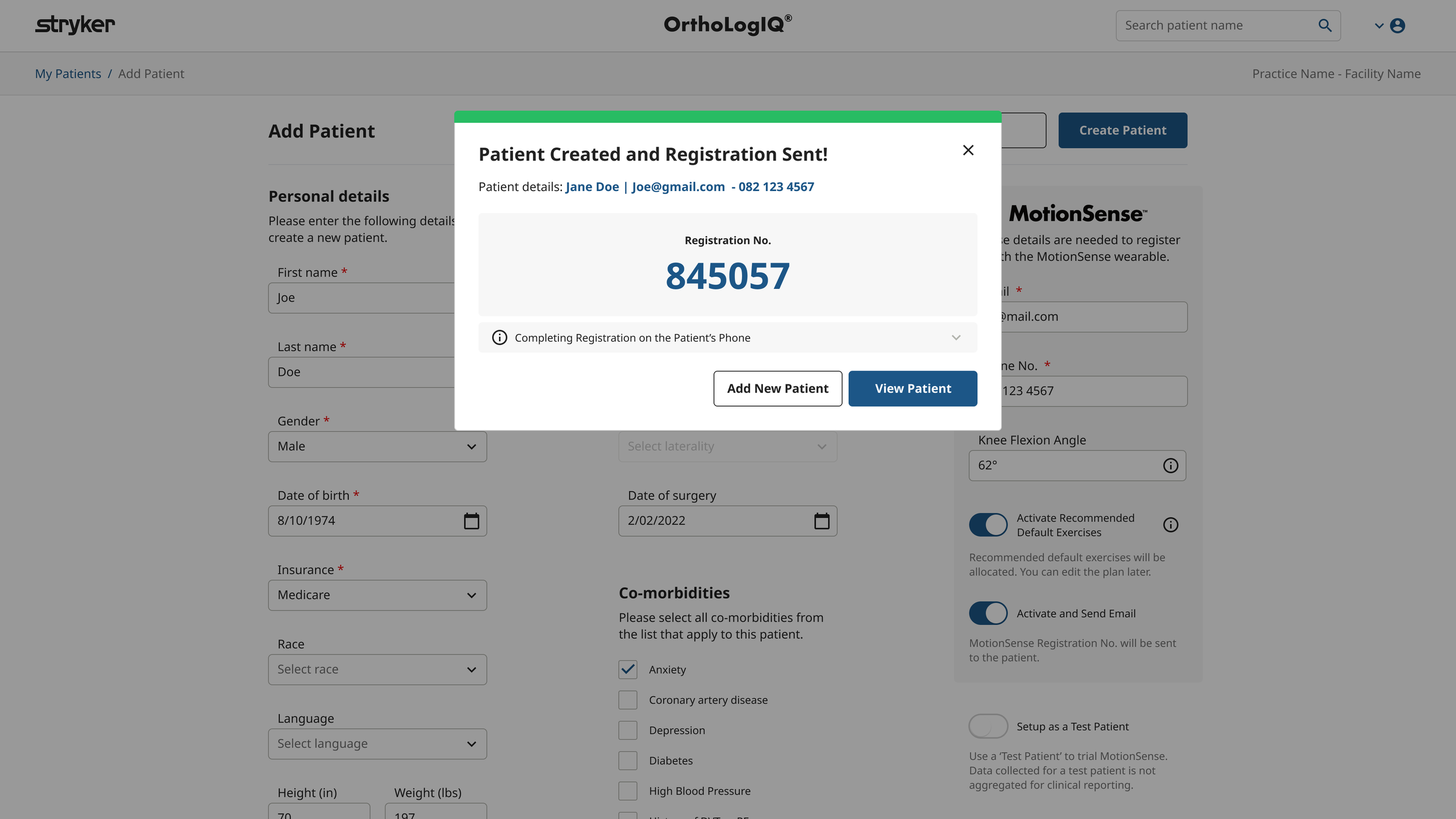 The original flow ended with a success modal prompting clinicians to confirm patient creation and choose between “Add New Patient” or “View Patient”. While the intent was sound, the modal felt visually cluttered, inconsistent with OrthoLogIQ patterns, and easy to dismiss in a high risk workflow.